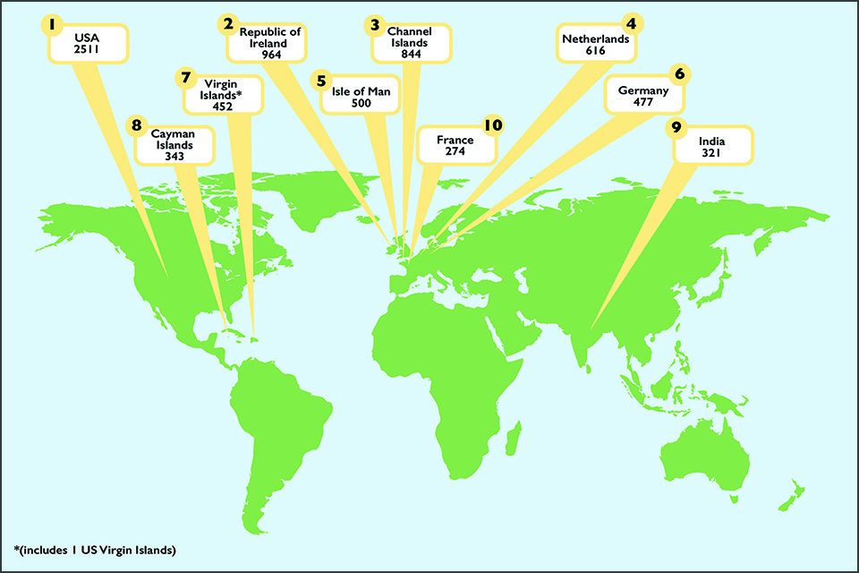 Top 10 originating countries for overseas corporate bodies, 31 March 2018 [Source: Companies Register Activities 2017/18, Companies House]