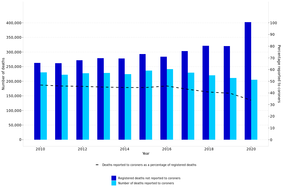 | 34% of all registered deaths were reported to coroners in 2020 | The proportion of registered deaths in England and Wales that were reported to coroners has decreased by six percentage points compared to 2019, the lowest proportion since 1995. |