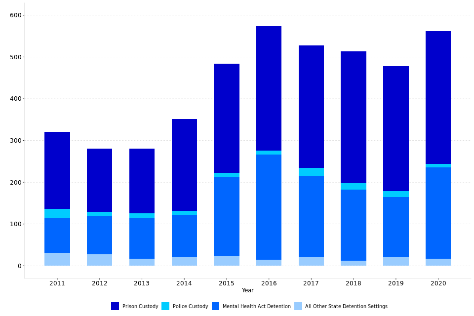 From 2015 to 2017 the inclusion of deaths under a Deprivation of Liberty Safeguard (DoLS) led to a distortion of the long-term trend seen in the number of deaths in state detention. This requirement was removed from 1 April 2017 and as such the deaths under DoLS have been plotted excluded from Figure 2 below, in order to aid year-on-year comparison of figures. For more information on DoLS please refer to the supporting guidance which accompanies this bulletin. There has been a general rise in deaths in state detention since 2011, although the number decreased from 2017 until 2020.