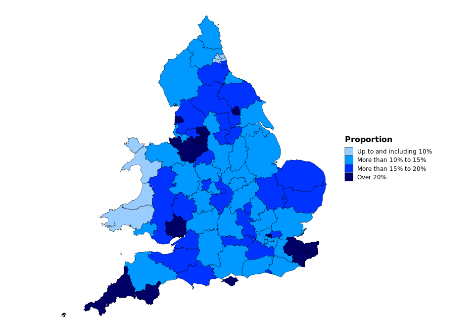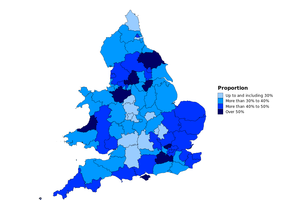 Figure 10: Coroner areas split by the number of deaths reported to coroners in 2020 as a proportion of registered deaths (Source: Table 11)[footnote 22] [footnote 23]