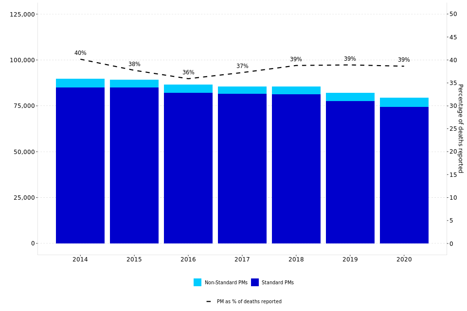 Post-mortem examinations may be classified as either standard or non-standard, depending on the nature of the examination. A non-standard post-mortem is defined as a post-mortem which requires special skills. A non-standard post-mortem could, for example, require a pediatric or other specialist pathologist. In 2020, almost all (94%) of post-mortems were ordered at a standard rate – this proportion is one percentage point lower than in 2019.