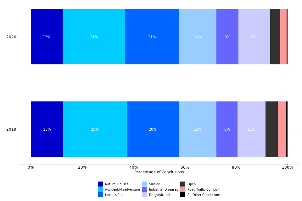 Figure 5 shows the proportion changes in inquest conclusions between 2019 and 2020.