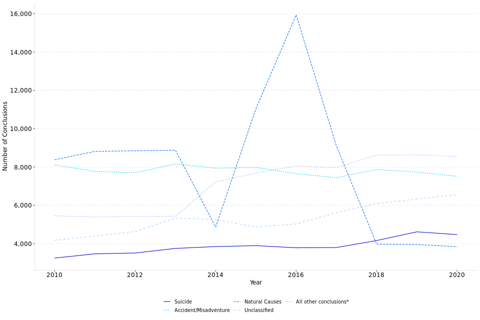 For the remaining conclusion types, alcohol/drugs related deaths have continued to increase. This year it increased by 426 cases (up 12%) to 3,840, the highest it has been since 2014.