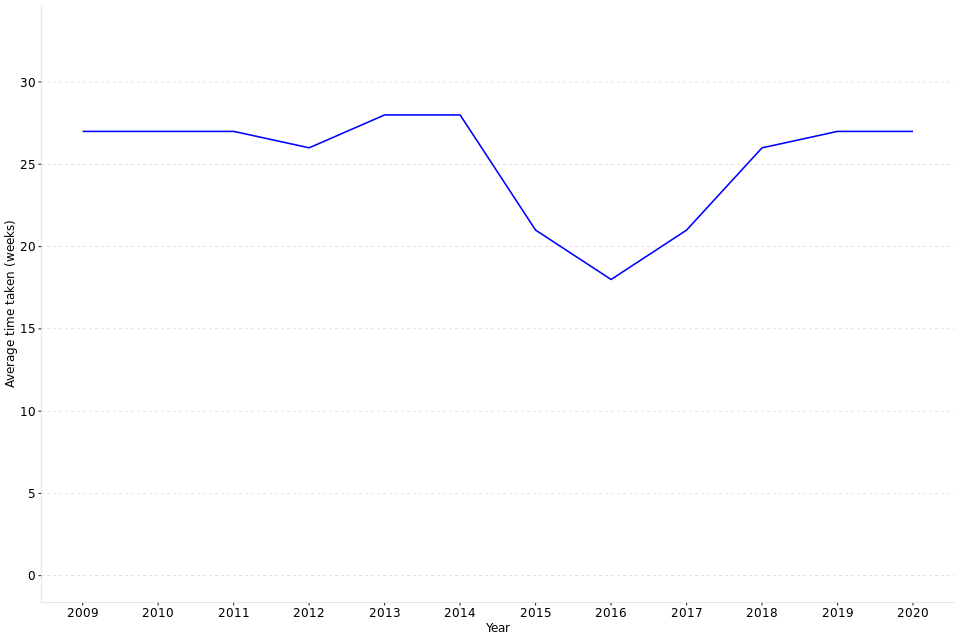 Figure 8: Average time taken to process an inquest (in weeks), 2009-2020 (Source: Table 9)