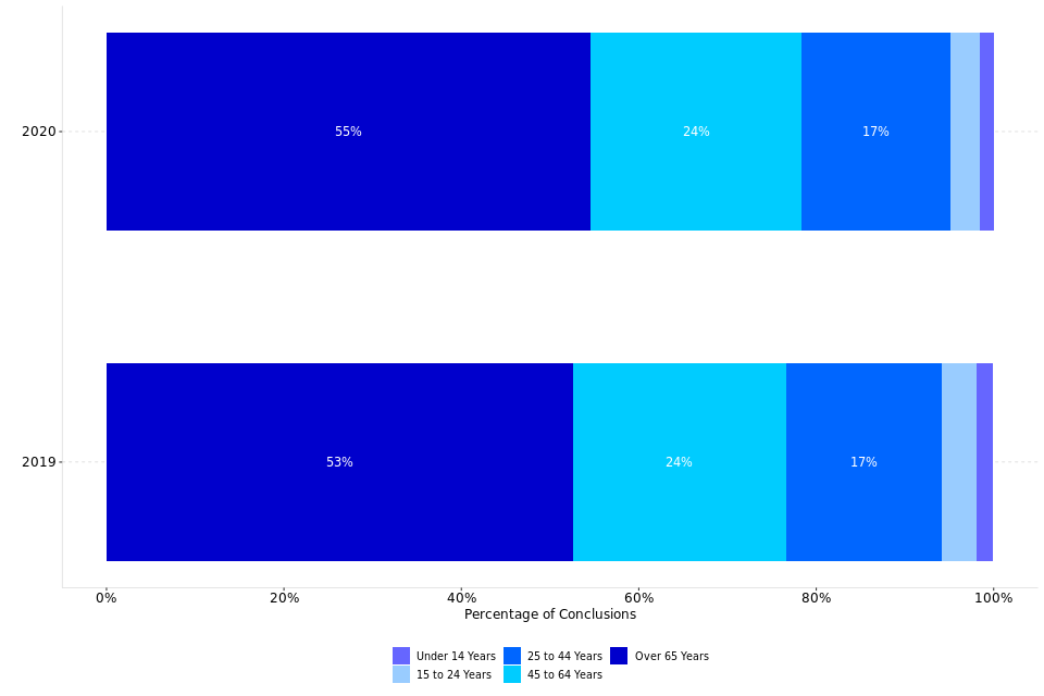 Of the inquests completed in 2020, 55% related to persons who were aged 65 years or over at time of death compared with 5% relating to persons under 25 years of age.