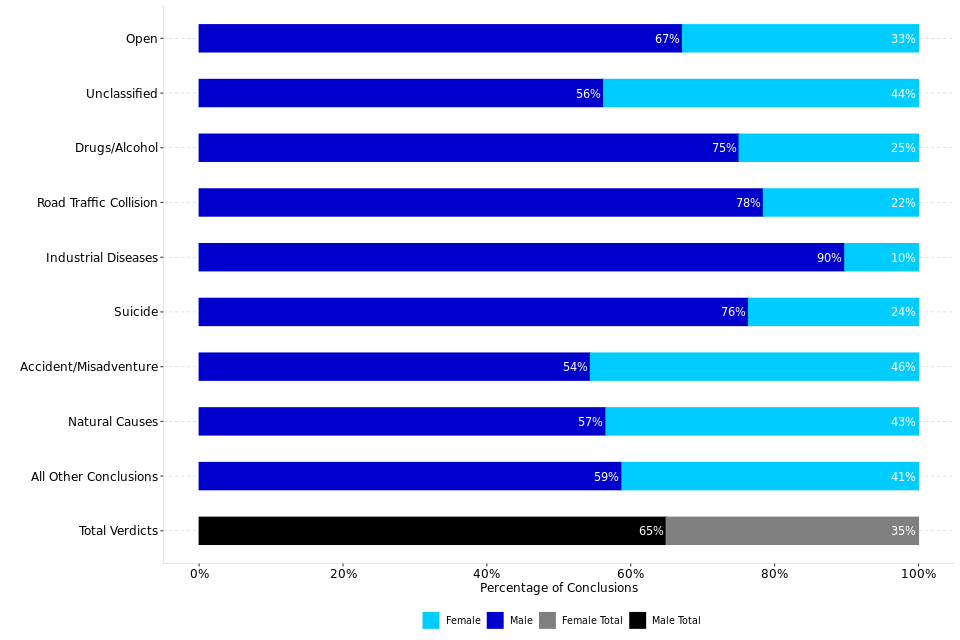 Male deaths accounted for 65% of all conclusions recorded in 2020 while female deaths accounted for 35%, the same percentages as in 2019.
