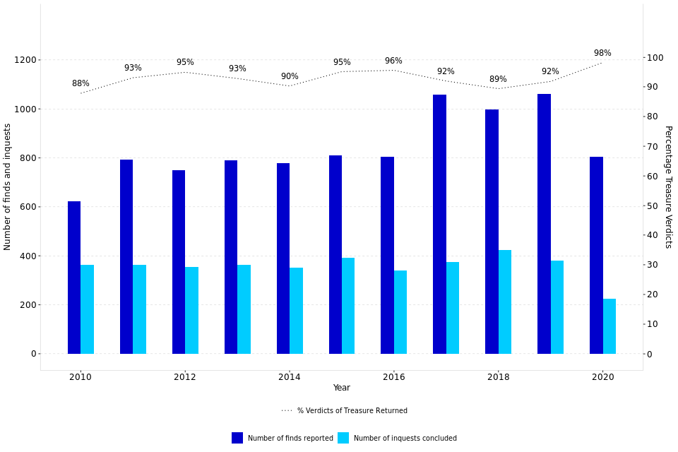 Figure 9: Finds reported to coroners, treasure inquests held under the Treasure Act, and proportion of Treasure verdicts returned, 2010-2020 (Source: Table 10)[footnote 20]