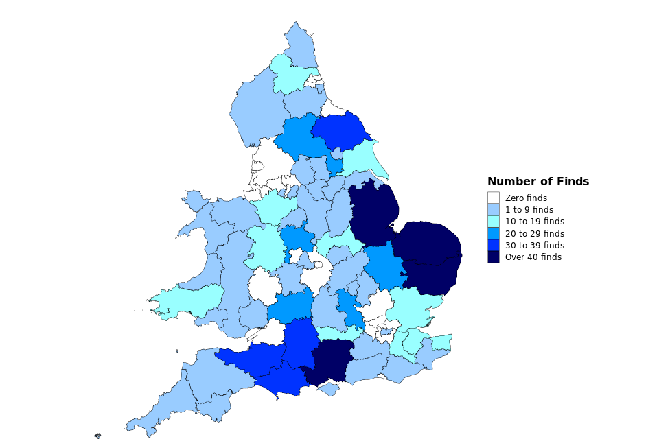 The number of finds and inquests held varies greatly across the country, most likely due to geographical and historical differences between areas. In 2020, 25 coroner areas had no treasure finds reported to them, whilst Norfolk had the highest number of treasure finds at 123. Map 4 shows treasure finds across England and Wales in 2020. More information about the duties of coroners to investigate treasure found within their jurisdiction and the provisions of the Treasure Act 1996 (and the previous Treasure Trove provisions) can be found in the supporting guidance