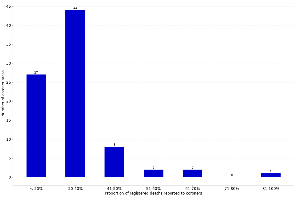 In 2020, the number of deaths reported to coroners as a proportion of registered deaths varied widely across coroner areas, from 16% in North Yorkshire (Western) to 82% in Gateshead and South Tyneside