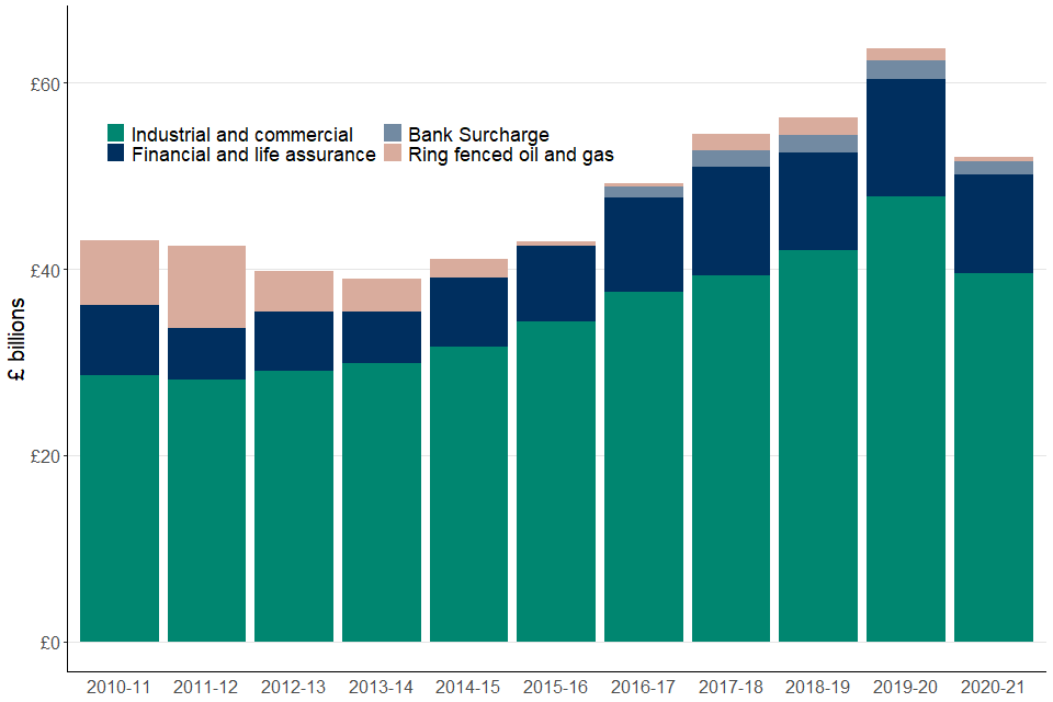 Chart 2 above shows CT receipts for the last 10 tax years, with each year split into the categories of industrial and commercial; financial and life assurance; bank surcharge; and ring-fenced oil and gas.