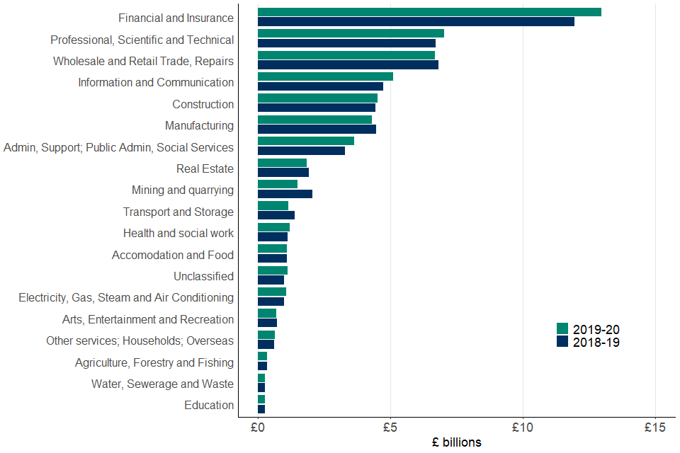 Chart 3 above shows CT liabilities by SIC sector for both tax year 2018 to 2019 and 2019 to 2020, ordered by size of liabilities. Some sectors have been combined in order to protect taxpayer confidentiality.