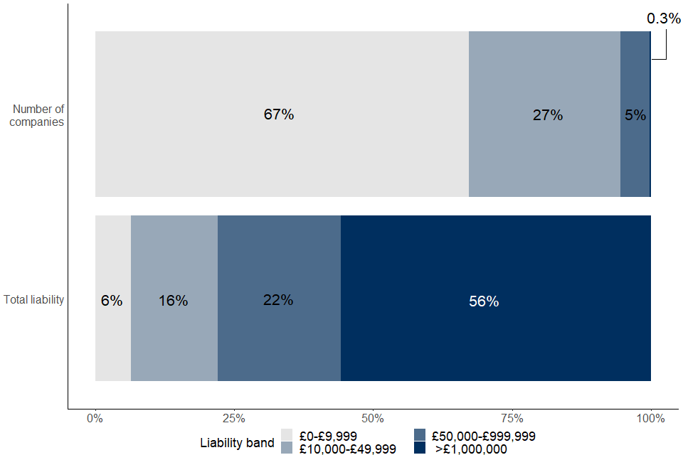 In tax year 2019 to 2020, approximately 4,300 companies (0.3% of all companies who had an amount of tax to pay) had liabilities over £1 million, yet these contributed 56%, or £30.9 billion, of total CT liabilities.