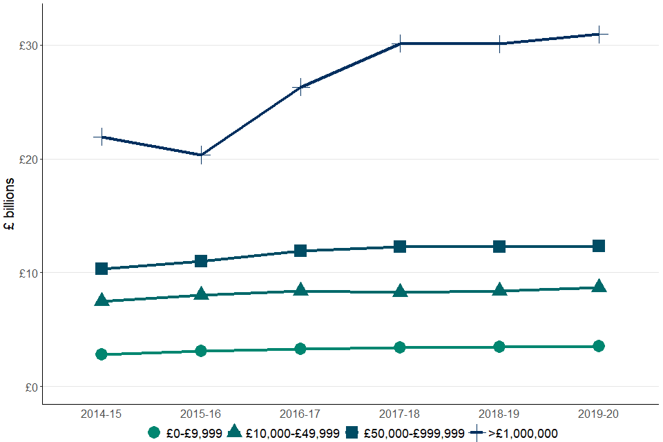 Liabilities from the highest band (above £1 million) have increased steadily since tax year 2015 to 2016 (£20.3 billion) before plateauing in 2017 to 2018 at £30.1 billion. Tax year 2019 to 2020 saw them increase again to £30.9 billion, an increase of 3%. This increase over the last 4 years has been primarily due to the growth in liabilities in the Finance and Insurance sector.