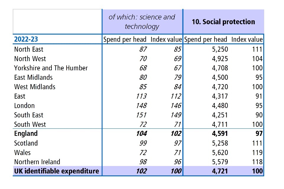 Here, the total UK identifiable spend per head for science and technology is £102 which equals 100 as the index value, because £102 = 100% of the identifiable UK expenditure for that function. Whereas for social protection, the spend per head for the UK is £4,721 which also equals 100, as it represents the total UK identifiable expenditure for that function.