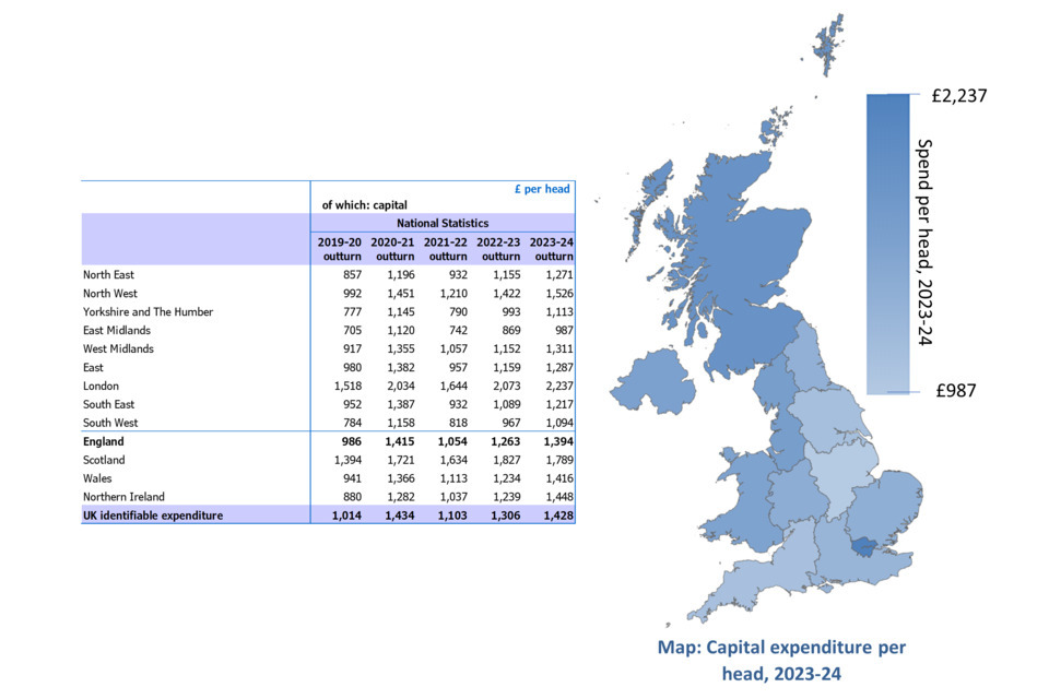 In 2023-24 UK identifiable spend (i.e. spending that can be identified as having been for the benefit of a particular area of the UK) increased to £884.5 billion from £849.9 billion the year before. On a per head basis [footnote 1] total UK expenditure rose by £386 between 2022-23 and 2023-24. Northern Ireland had the highest spend per head at £15,371, followed by Scotland at £14,759. England had the lowest spend per head at £12,625. Non-identifiable expenditure (i.e. spend which is deemed to be on behalf of the UK as a whole), decreased by just over £1 billion in 2023-24.