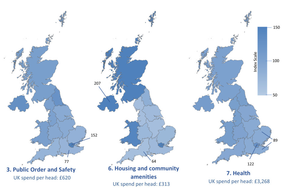 Maps based on Table A.16: UK identifiable expenditure by function, per head, indexed, 2023-24