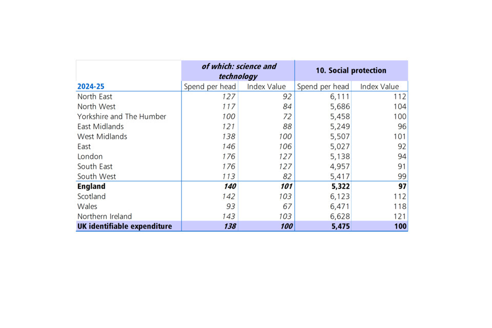 Here, the total UK identifiable spend per head for science and technology is £138 which equals 100 as the index value, because £138 = 100% of the identifiable UK expenditure for that function. Whereas for social protection, the spend per head for the UK is £5,475 which also equals 100, as it represents the total UK identifiable expenditure for that function.