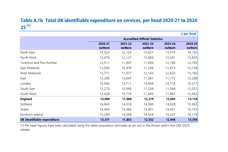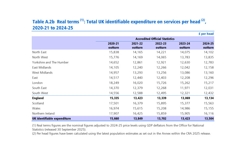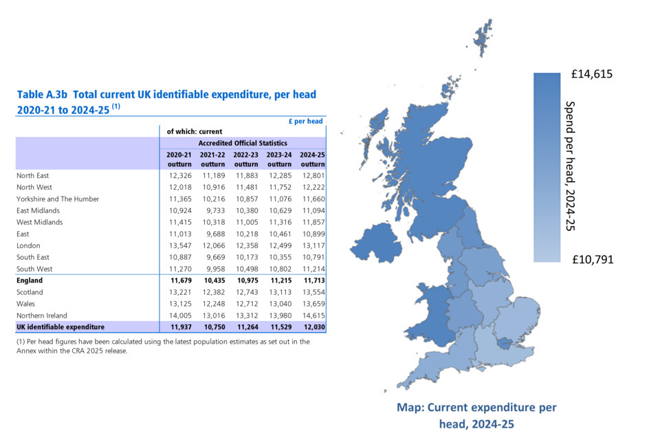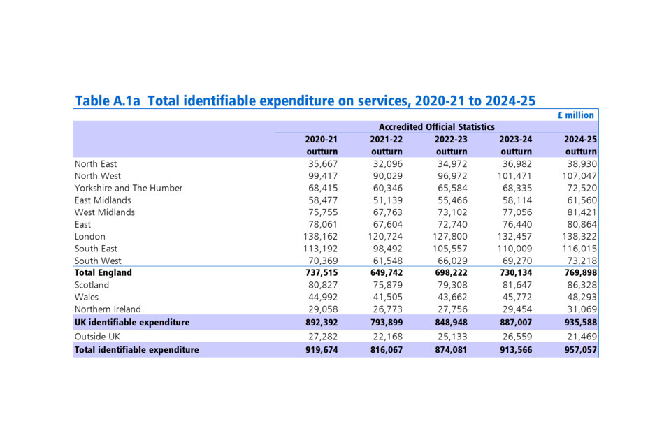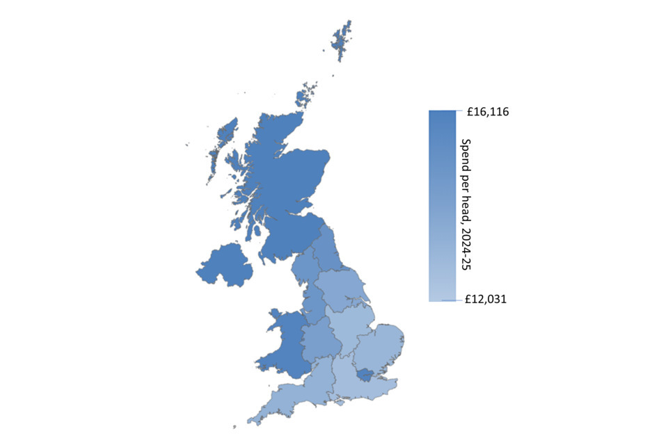 In 2024-25 UK identifiable spend (i.e. spending that can be identified as having been for the benefit of a particular area of the UK) increased to £935.6 billion from £887.0 billion the year before. On a per head basis [footnote 1] total UK expenditure rose by £560 between 2023-24 and 2024-25. Northern Ireland had the highest spend per head at £16,116, followed by Scotland at £15,563. England had the lowest spend per head at £13,134. Non-identifiable expenditure (i.e. spend which is deemed to be on behalf of the UK as a whole), increased by just under £6 billion in 2024-25, compared to the previous year.