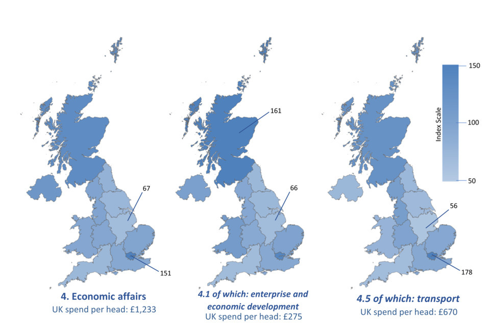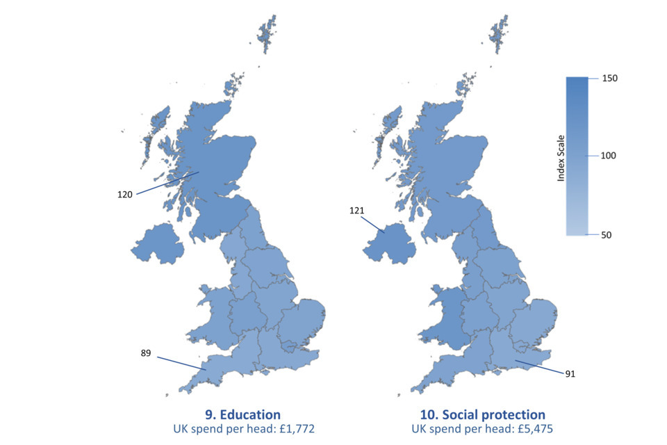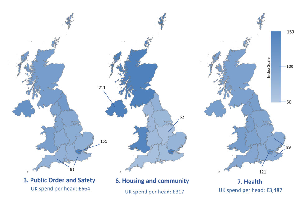 Maps based on Table A.16: UK identifiable expenditure by function, per head, indexed, 2024-25