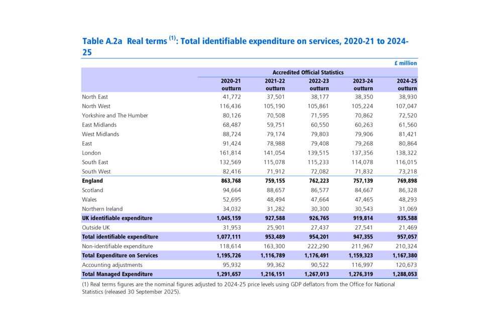 Real terms figures are the nominal figures adjusted to 2024-25 price levels using GDP deflators from the Office for National Statistics (released 30 September 2025).