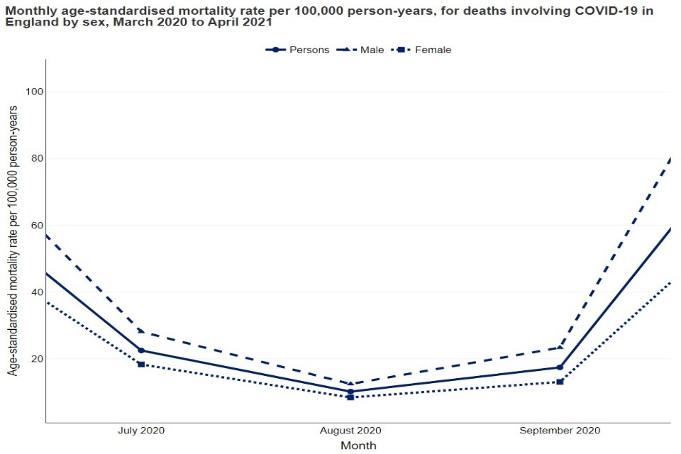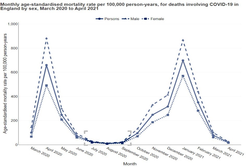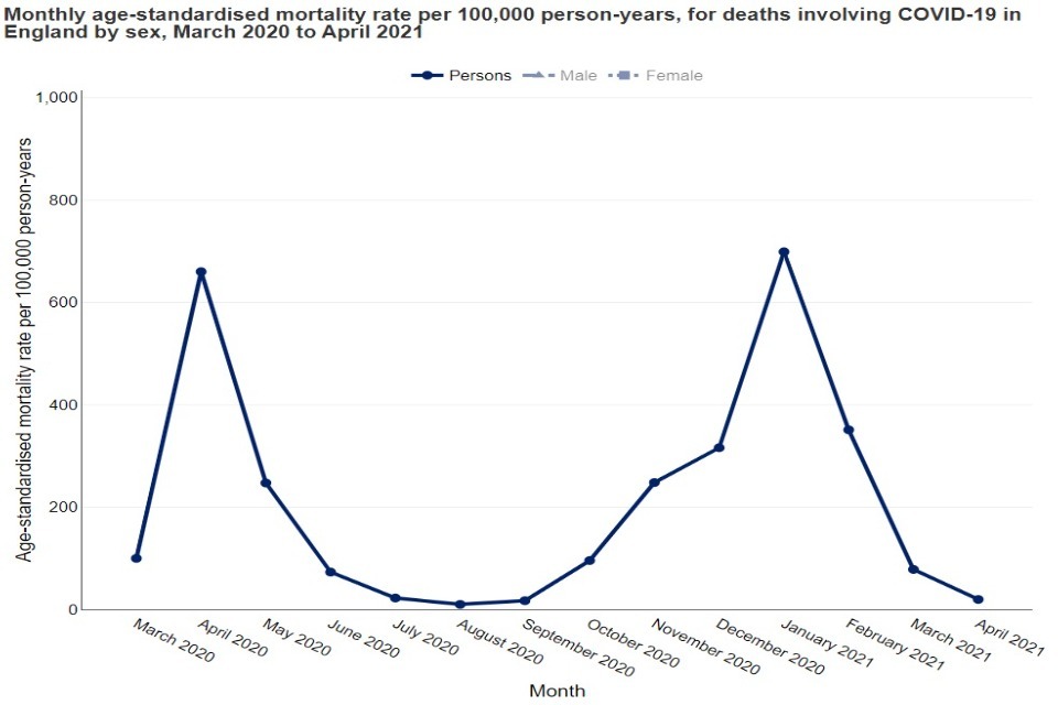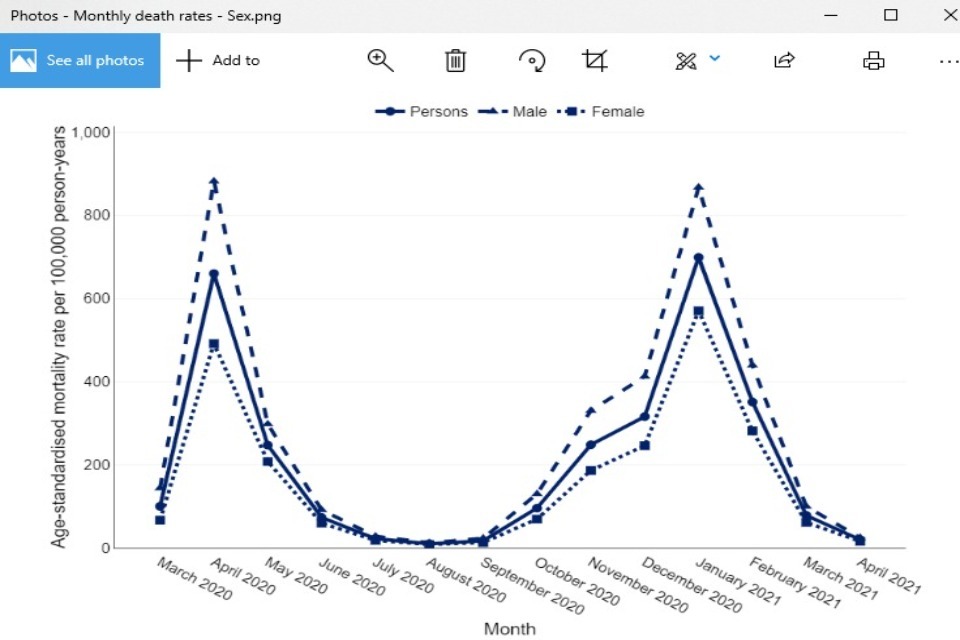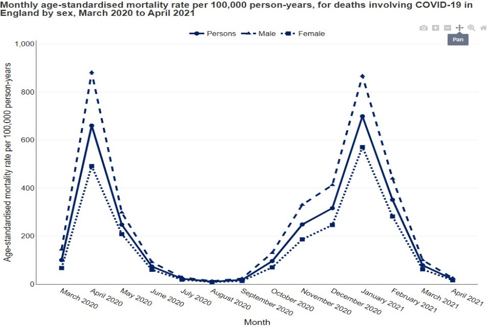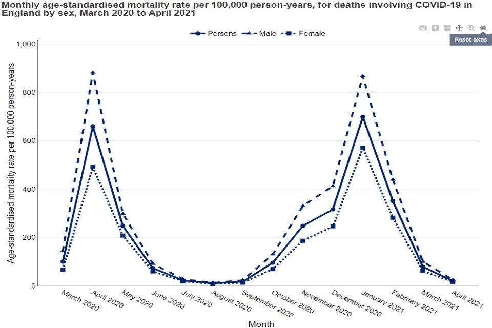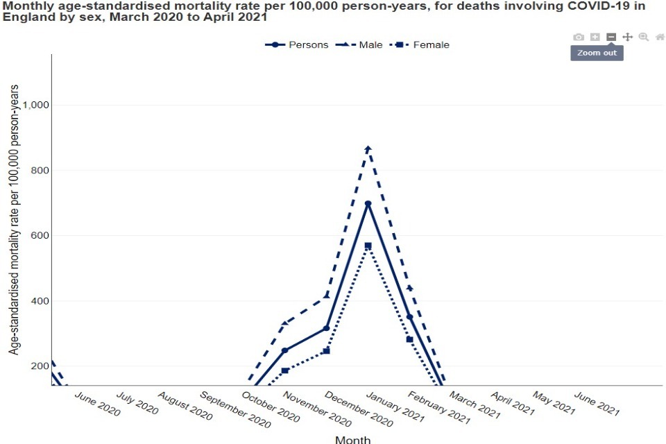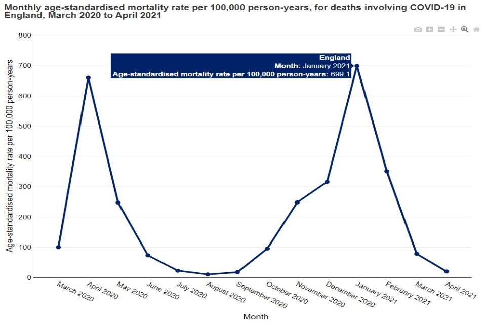 In the chart below, the peak in January 2021 has been hovered over, presenting the geography, the time period and the age-standardised mortality rate: