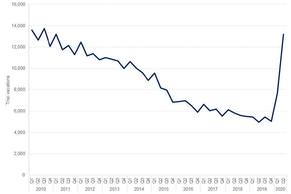 The volume of vacated trials[footnote 9] has increased from a series low in Q4 2019. In Q2 2020 there were 4,529 vacated trials, up 38% compared to Q2 2019 and 17% on Q1 2020 - back to levels previously seen in 2015.