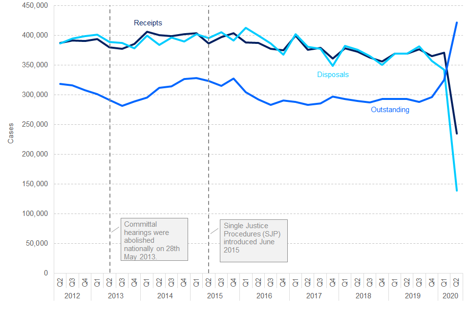 | Magistrates’ court: large increase in outstanding cases | Receipts and disposals fell sharply, down 36% and 62% respectively on Q2 2019. As disposals fell by more than receipts, outstanding cases continued to rise, up 44% to around 422,000 cases. |