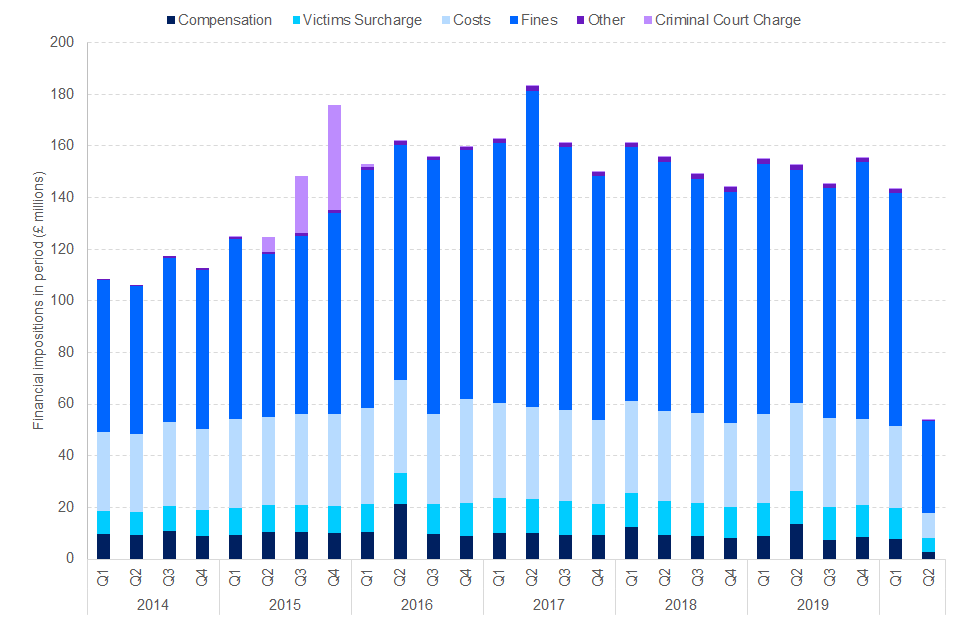 Following the impacts of the COVID-19 response the overall value of impositions fell by around £98.7m on Q2 2019, with falls against all imposition types. The majority of this is largely due to decreases in fines, where the value of fines imposed fell by £54m, down 60% compared with Q2 2019.