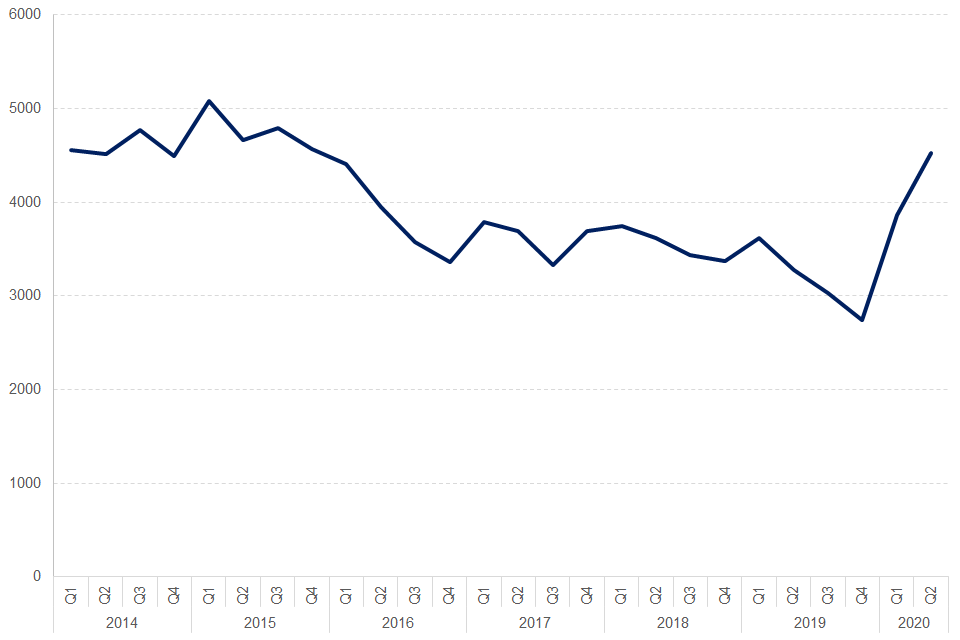 In Q2 2020 there were 45% fewer receipts and 50% fewer disposals compared to Q2 2019. The volume of outstanding cases increased by 25% over the same period, from around 34,277 in Q2 2019 to 42,707 in Q2 2020.