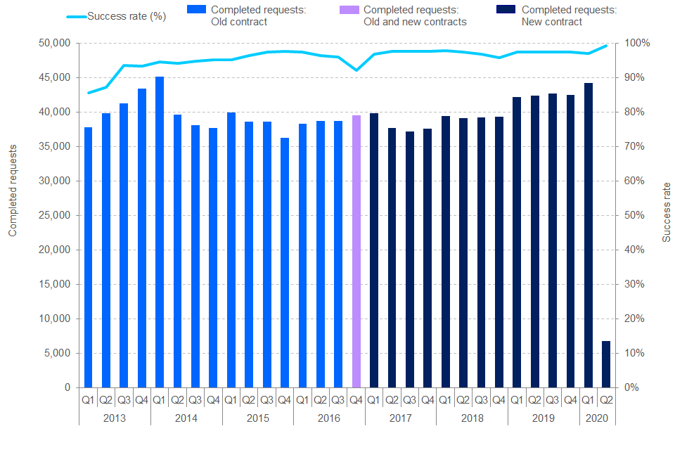 The success rate of requests has increased compared to Q2 2019 up from 97% to 99%, while a third (34%) of all requests were cancelled, up from 17% in Q2 2019. The number of completed requests has fallen by 84% on Q2 2019.