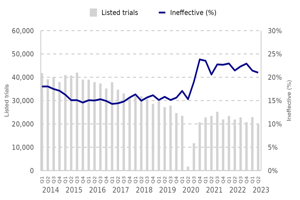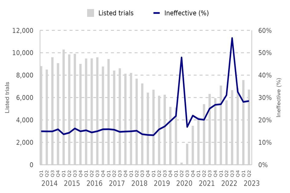 - Of trials listed for Q1 2023, the proportion that were effective was unchanged on the previous quarter, remaining at 42%. Similarly, the cracked rate (37%) and ineffective rate (21%) were unchanged – the ineffective rate remains above pre-COVID levels (~15-17%).