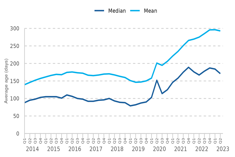 The average age of an outstanding case has increased markedly on pre-COVID levels. Both the median and mean averages fell on the previous quarter but remain close to series peaks. In Q2 2023 the median age of all outstanding cases decreased by 7% on the previous quarter, from 184 days to 171 days.