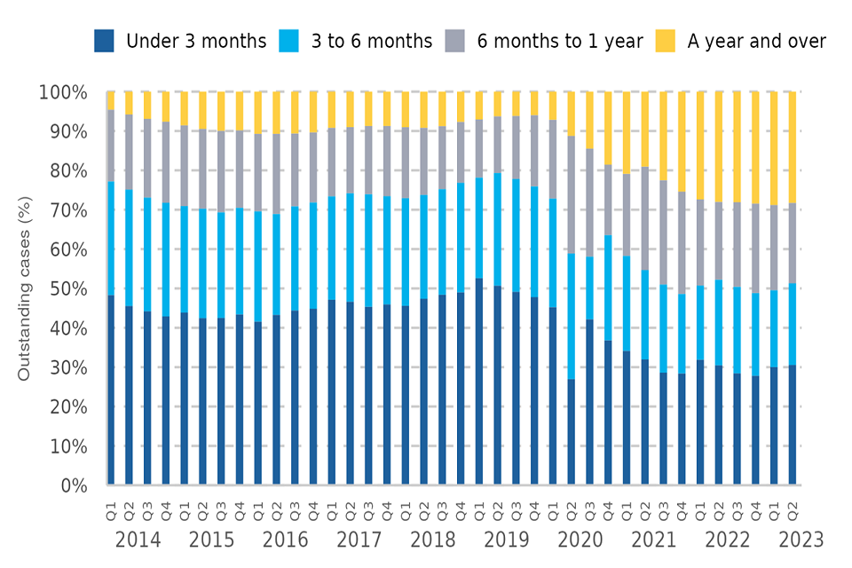 At the end of Q2 2023 there were 17,649 cases that had been outstanding for a year or more. This has tended to increase since Q4 2019 and accounted for 28% of the outstanding caseload in the latest quarter.