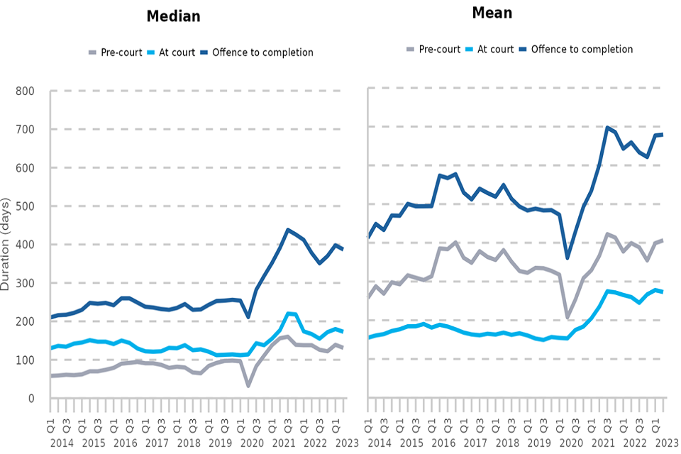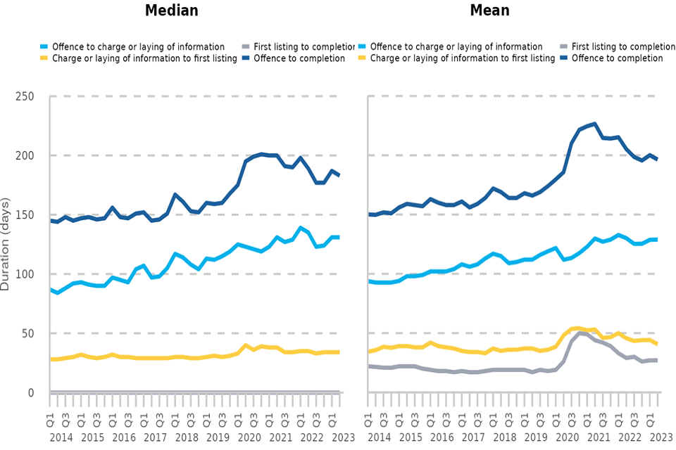 ‘Pre-court’: the median time from ‘offence to first listing’ decreased by 6% from 139 days in Q1 2023 to 131 days in Q2 2023.