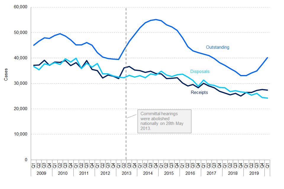 | Magistrates’ court: large increase in outstanding cases | Receipts remained stable whereas disposals fell by 7% on Q1 2019. As a result, outstanding cases increased by 11%, back to levels previously seen in 2015. |