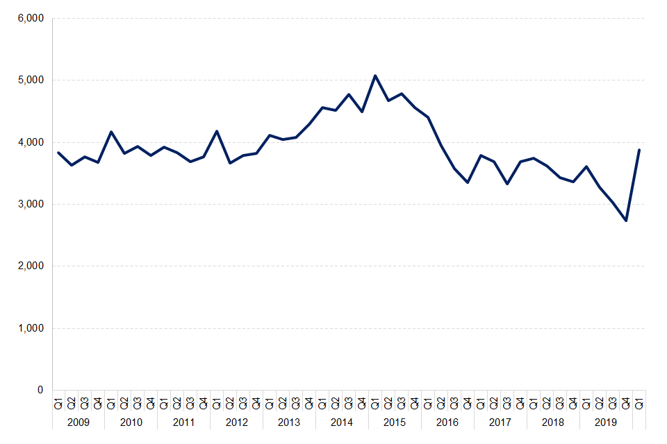 On 23rd March 2020 jury trials were suspended[footnote 5]. and the operational capacity of the court estate was reduced as part of the ongoing response to the COVID-19 pandemic. Although only accounting for just over one weeks’ worth of data for Q1 2020, COVID-19 has had an impact on the Crown Court caseload statistics. As a result, there has been a decrease in disposals and an increase in the number of outstanding cases in the Crown Court.