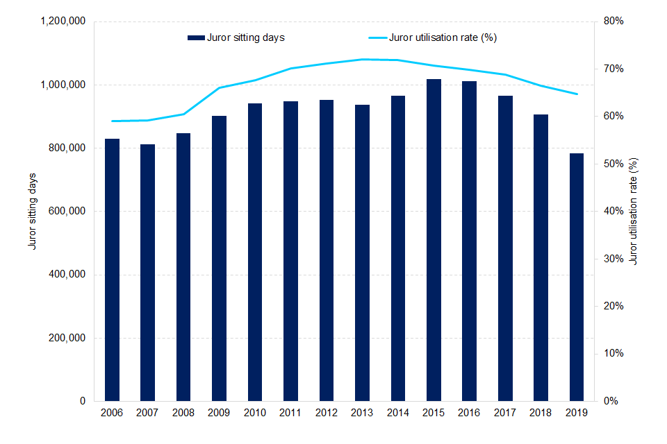 The number of juror sitting days decreased by 14% in the latest year, to a series low of 784,087 in 2019. Since 2014, the juror utilisation rate[footnote 10] has been falling year-on-year – this continued in 2019 with a rate of 65%.