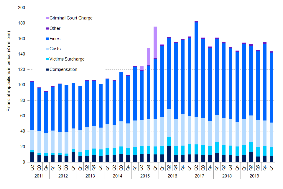Figure 7: HMCTS management information: Financial impositions by imposition type, England and Wales, Q2 2011 – Q1 2020 (Source: Table A2)