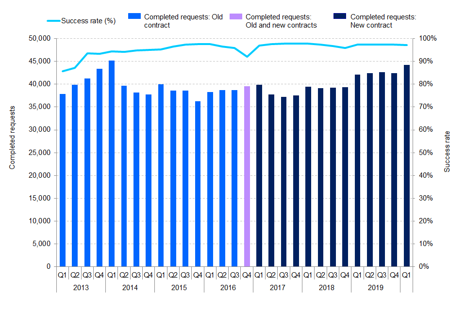 The overall success rate of requests was 97% in Q1 2020 and has remained broadly stable since 2017, between 96% and 98%. The success rate for non-DPSI[footnote 13] languages has remained the lowest of all service types since Q4 2016. In Q1 2020 it was 86%, compared to 98% for standard languages and 96% for special services.