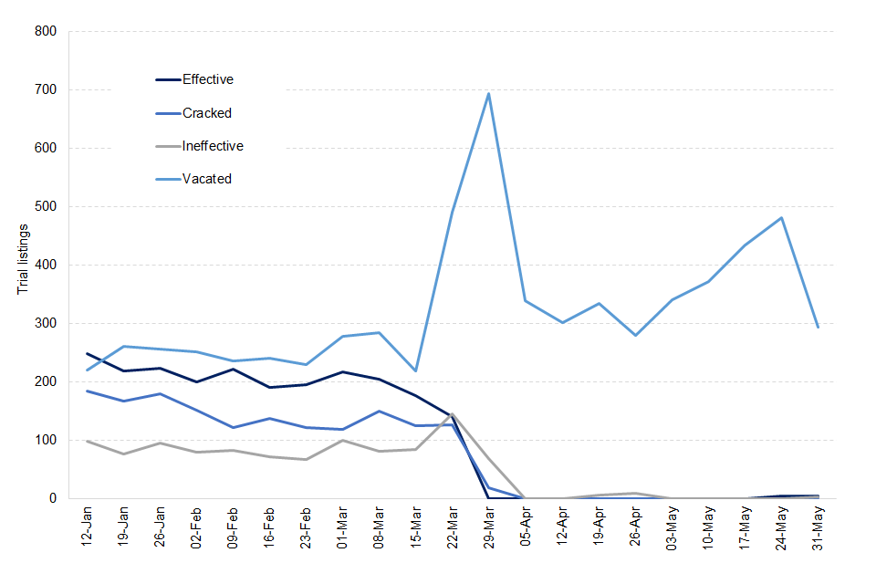 On average around 250 trials were vacated per week between January and 22nd March, this has increased to around 400 between 29th March and 31st May 2020, with a peak in the week ending 29th March 2020.