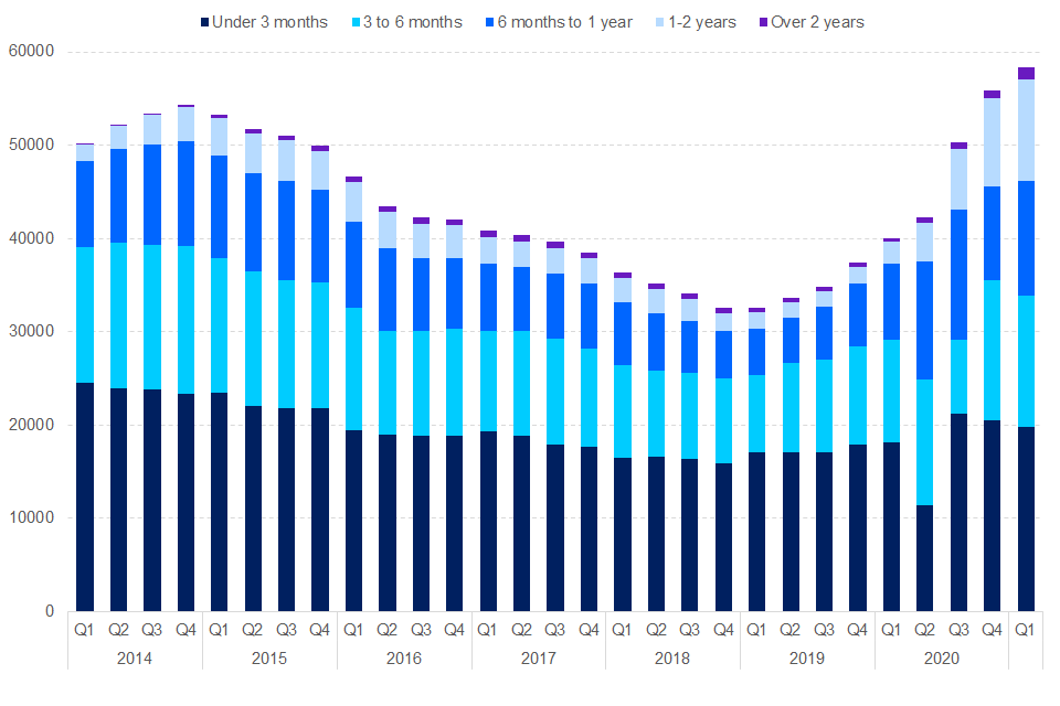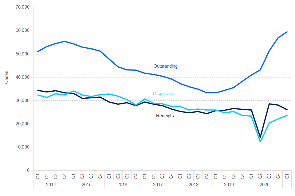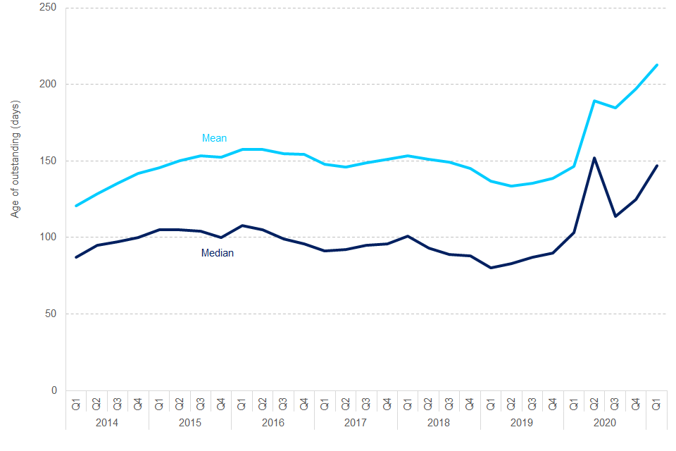 The proportion of cases which have been outstanding for a year or more has increased sharply – from 7% in Q1 2020 to 21% in Q1 2021.