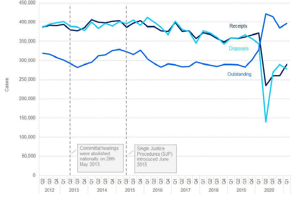 The latest published HMCTS management information provides weekly volumes of receipts, disposals and outstanding cases for all cases types at the magistrates’ courts (e.g. including civil and enforcement in addition to criminal cases).