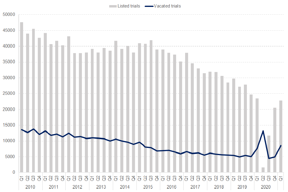 Figure 2: Magistrates’ courts listed trials and vacated trials, Q1 2010 – Q1 2021 (Source: Table M2)
