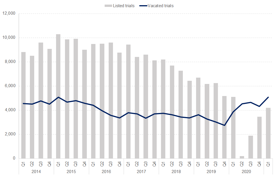 Figure 6: Crown Court listed trials and vacated trials, Q1 2014 – Q1 2021 (Source: Table C2)