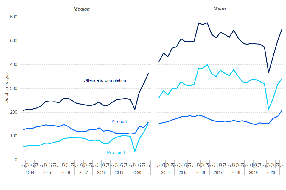 The time from offence to completion at the magistrates’ court increased by 14%, from 175 days in Q1 2020 to 200 days in Q1 2021. At the Crown Court, the time from receipt to completion for all cases increased by 23%, up from 96 days in Q1 2020 to 118 days in Q1 2021.