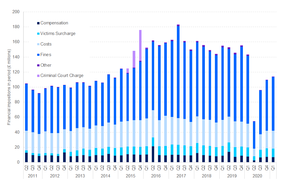 Following the continued impacts of the COVID-19 response the overall value of impositions remains below pre-COVID levels. In Q1 2021 the value of impositions rose by 4% on the previous quarter and more than double the series low seen in Q2 2020. The majority of this is largely due to increases in fines, where the value of fines imposed has doubled (from £35.9m in Q2 2020 to £71.4m in Q1 2021).