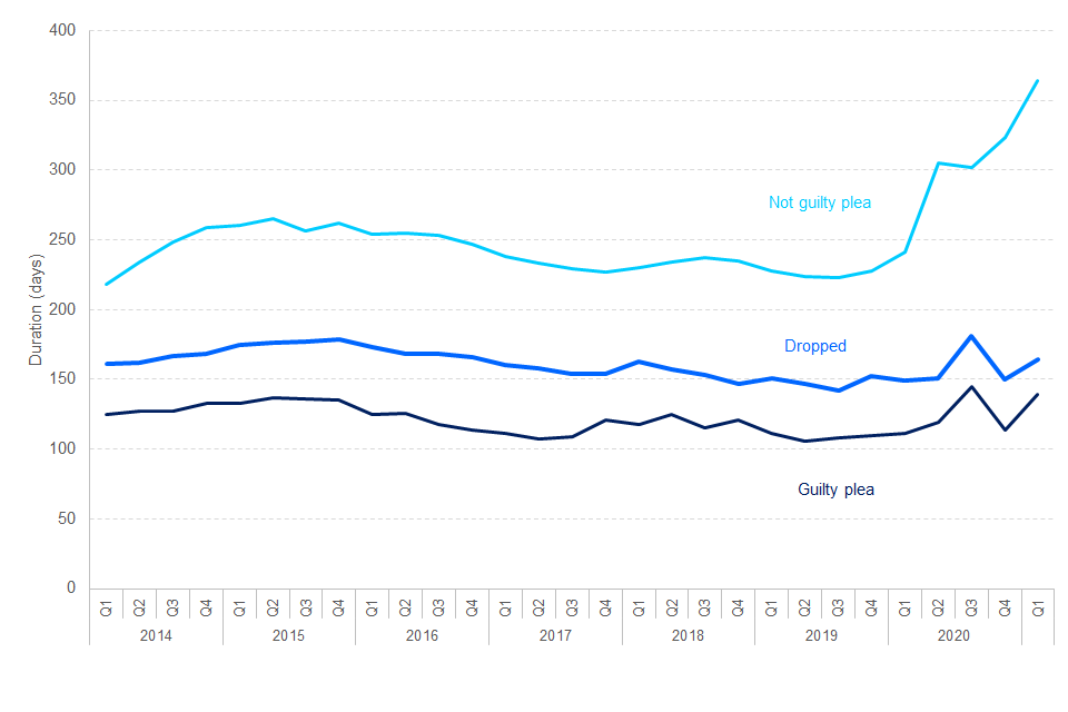 - Median ‘pre-court’ time increased by 51% from 100 days in Q1 2020 to 151 days in Q1 2021. While median ‘at court’ time increased by 46% over the same period, from 109 days to 159 days.