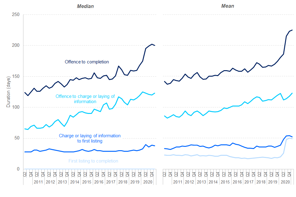 The median duration from offence to completion of defendants dealt with at the magistrates’ courts (excluding those sent to Crown Court) has increased by 14%, from 175 days in Q1 2020 to 200 days in Q1 2021.