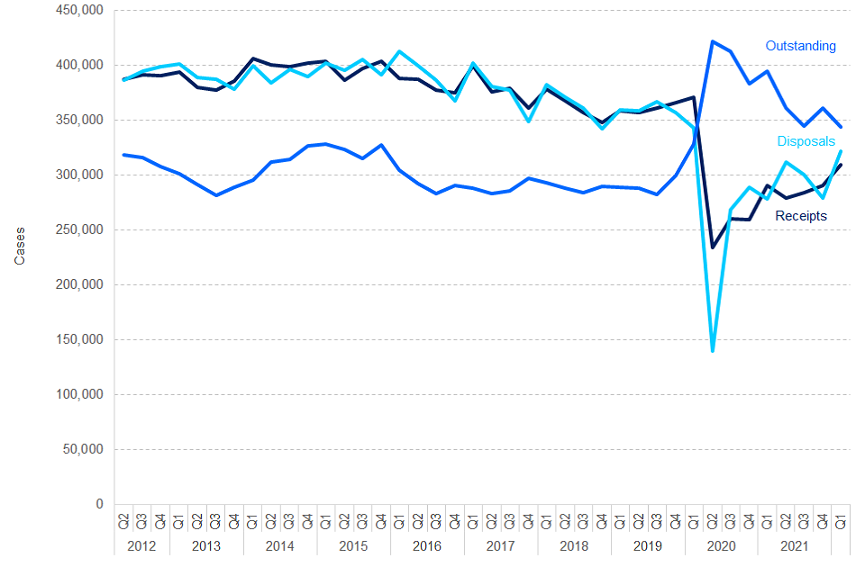 Receipts and disposals have tended to rise from series lows in Q2 2020 when measures were put in place to manage the risks of the pandemic in courts[footnote 3]. However, levels remain well below those seen in the previous year following the review of court arrangements on the 23rd March 2020[footnote 4] and the return of restrictions in January 2021[footnote 5].