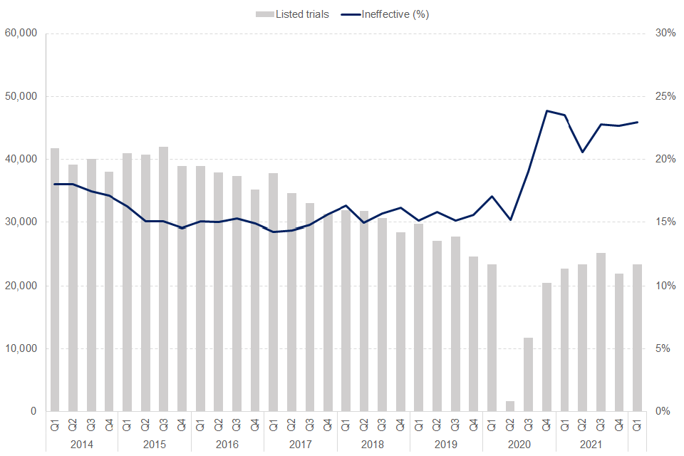 The ineffective trial rate was unchanged on the previous quarter at 27%, remaining above the rates typically seen between 2014 and 2019. ‘Overlisting’ and the absence of the defendant remain the largest contributing reasons in Q1 2021.